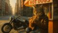 まっすぐに伸びるオロロンラインを、猫ライダーが静かに走り抜ける。海風を受けて耳がぴんと立ち、どこか引き締まった表情だけれど、その奥には「すごい景色だな…!」という素直なワクワクが隠しきれない。右手には果てまで続く海、左手には延々と続く一本道。北海道らしい広々とした景色の中で、バイクの鼓動と心の高鳴りが同じリズムになる。大げさに喜びを表すわけでもなく、ただ景色に見とれながら走るその姿が、どこかコミカルでかわいらしい。旅の空気と猫ライダーの素直な気持ちが、穏やかに溶け合っていく